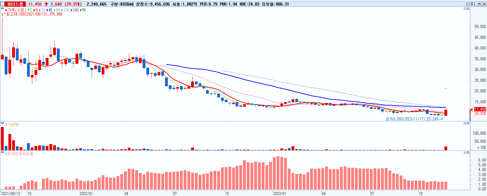 - 원티드랩 (11,450원 ▲ 29.97% , 시총: 1,083억, 거래량: 2,284,732, 거래대금:241억)
