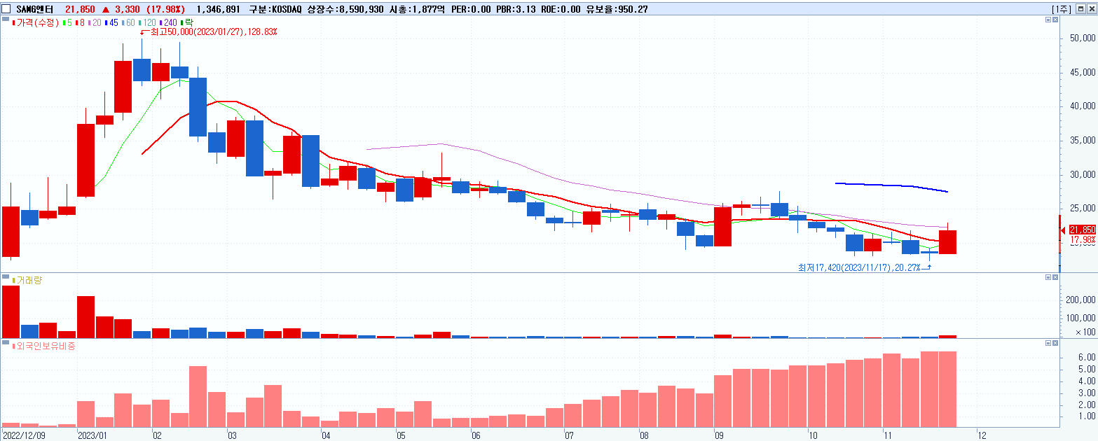 - SAMG엔터 (21,850원 ▲ 17.98% , 시총: 1,877억, 거래량: 1,354,380, 거래대금:293억)