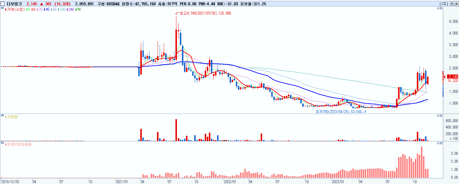 - 다보링크 (2,145원 ▲ 16.32% , 시총: 917억, 거래량: 2,062,977, 거래대금:43억)