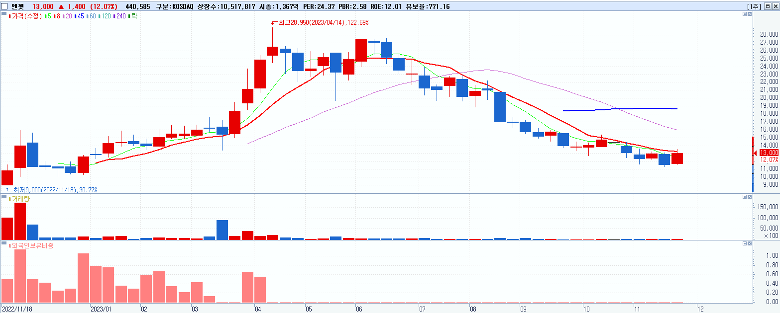 - 엔젯 (13,000원 ▲ 12.07% , 시총: 1,367억, 거래량: 441,872, 거래대금:57억)