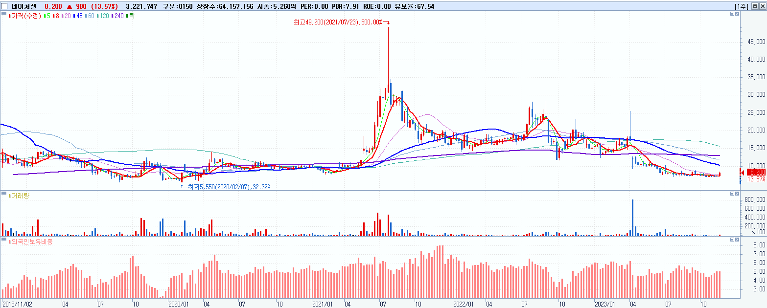 - 네이처셀 (8,200원 ▲ 13.57% , 시총: 5,261억, 거래량: 3,236,940, 거래대금:260억)