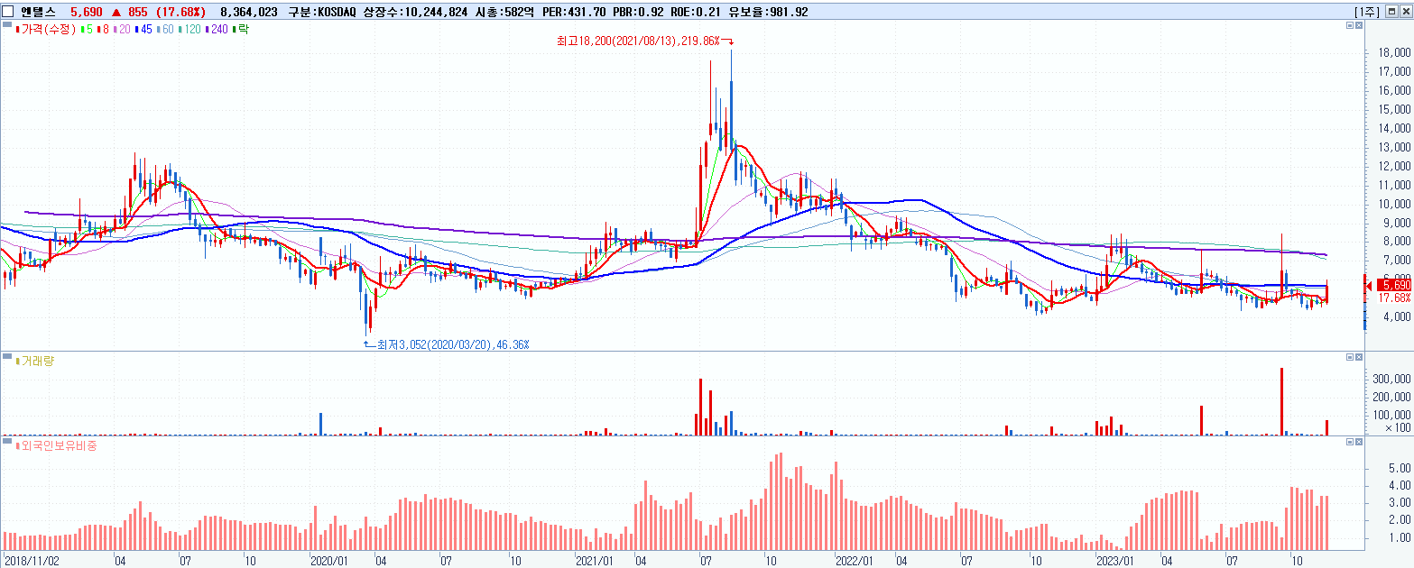 - 엔텔스 (5,690원 ▲ 17.68% , 시총: 583억, 거래량: 8,444,251, 거래대금:481억)