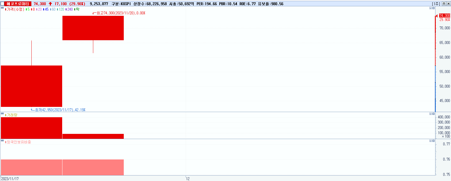 - 에코프로머티 (74,300원 ▲ 29.9% , 시총: 50,693억, 거래량: 9,254,294, 거래대금:6,367억)