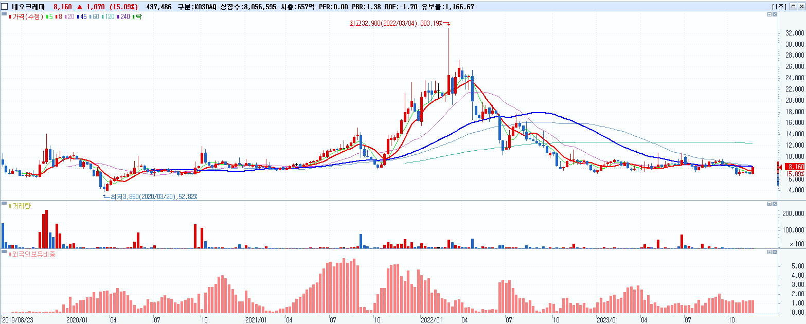 - 네오크레마 (8,160원 ▲ 15.09% , 시총: 657억, 거래량: 438,478, 거래대금:35억)