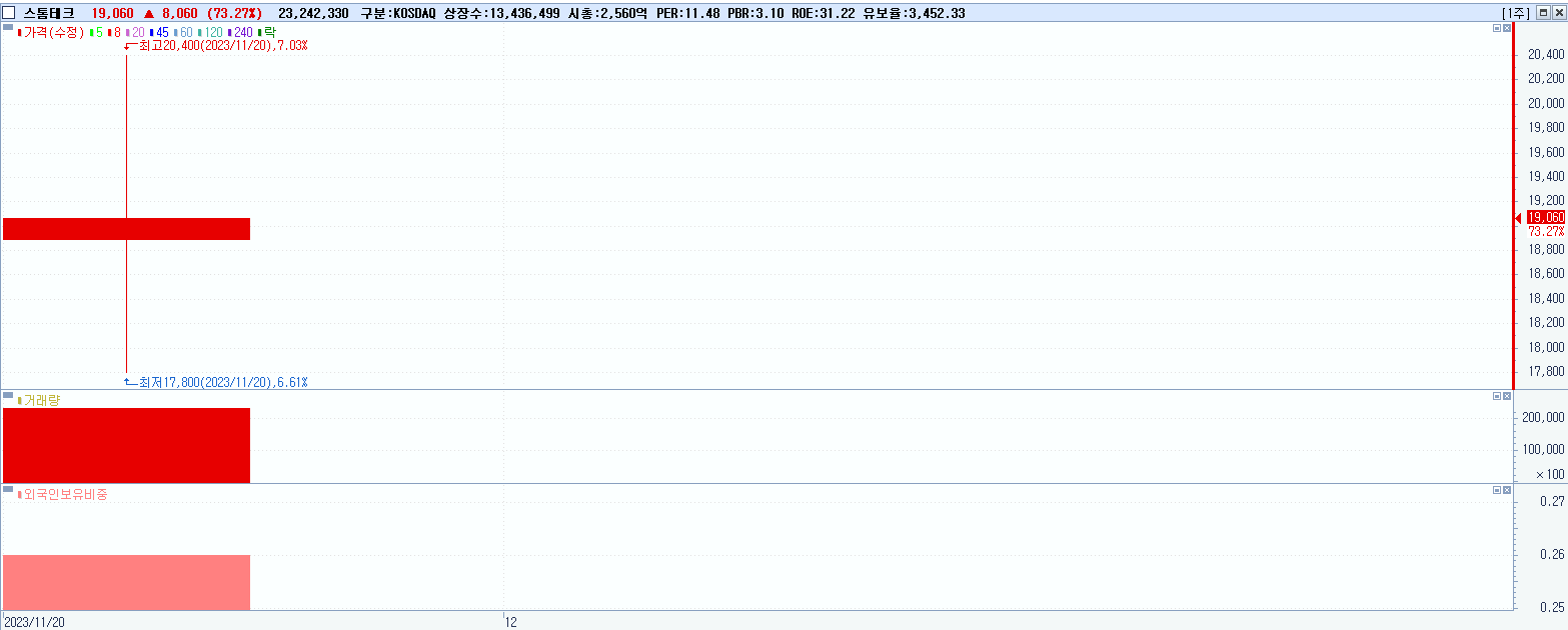 - 스톰테크 (19,060원 ▲ 73.27% , 시총: 2,561억, 거래량: 23,755,518, 거래대금:4,582억)