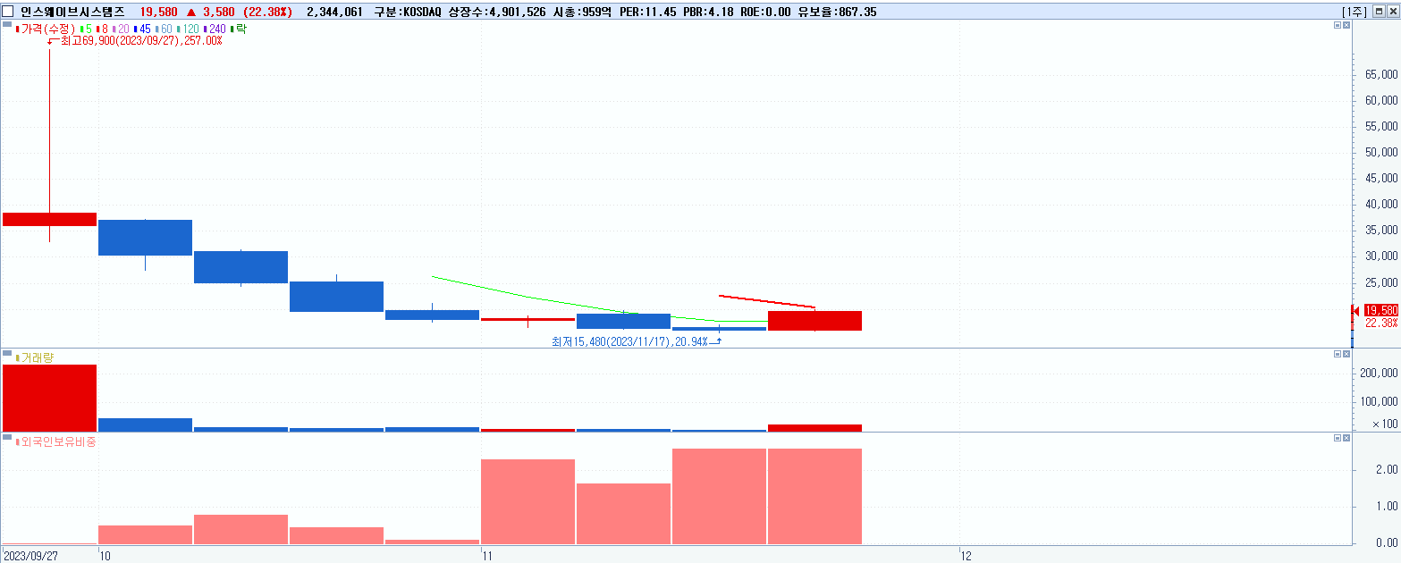 - 인스웨이브시스템즈 (19,580원 ▲ 22.38% , 시총: 960억, 거래량: 2,437,135, 거래대금:456억)