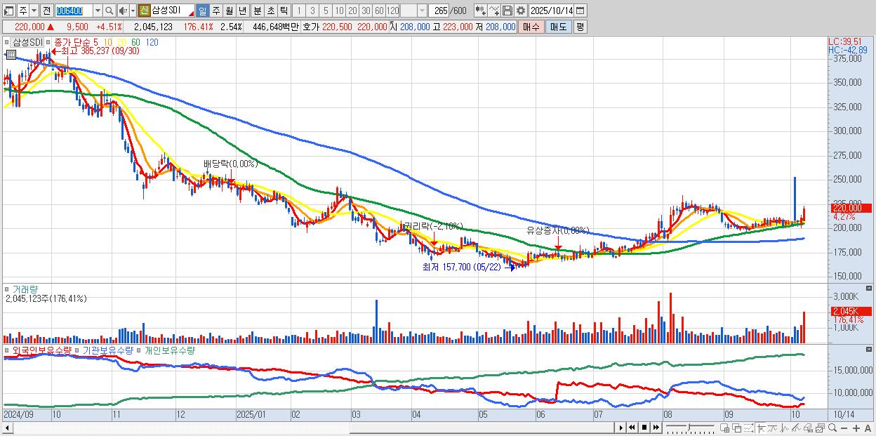 - 삼성SDI (220,000원 ▲ 4.51% , 시총: 177,288억, 외국인 순매수 거래금:236억)