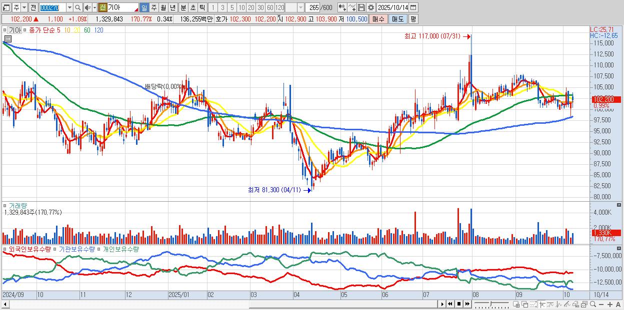 - 기아 (102,500원 ▲ 1.38% , 시총: 403,634억, 외국인 순매수 거래금:251억)