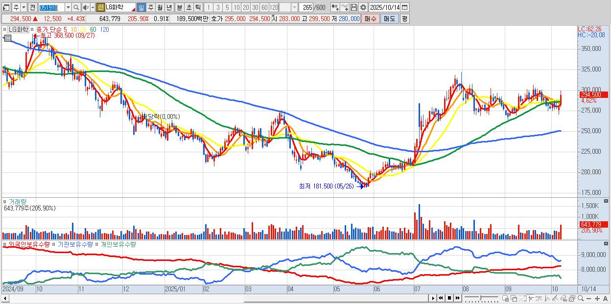 - LG화학 (296,500원 ▲ 5.14% , 시총: 209,306억, 외국인 순매수 거래금:496억)
