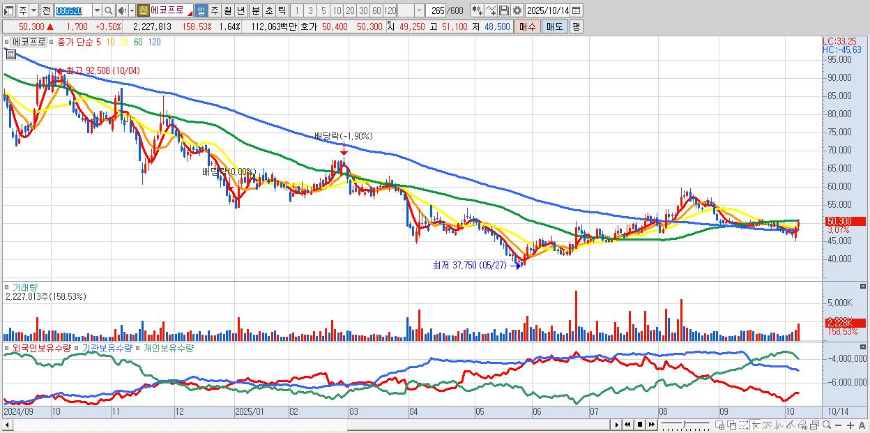 - 에코프로 (50,400원 ▲ 3.7% , 시총: 68,431억, 외국인 순매수 거래금:167억)