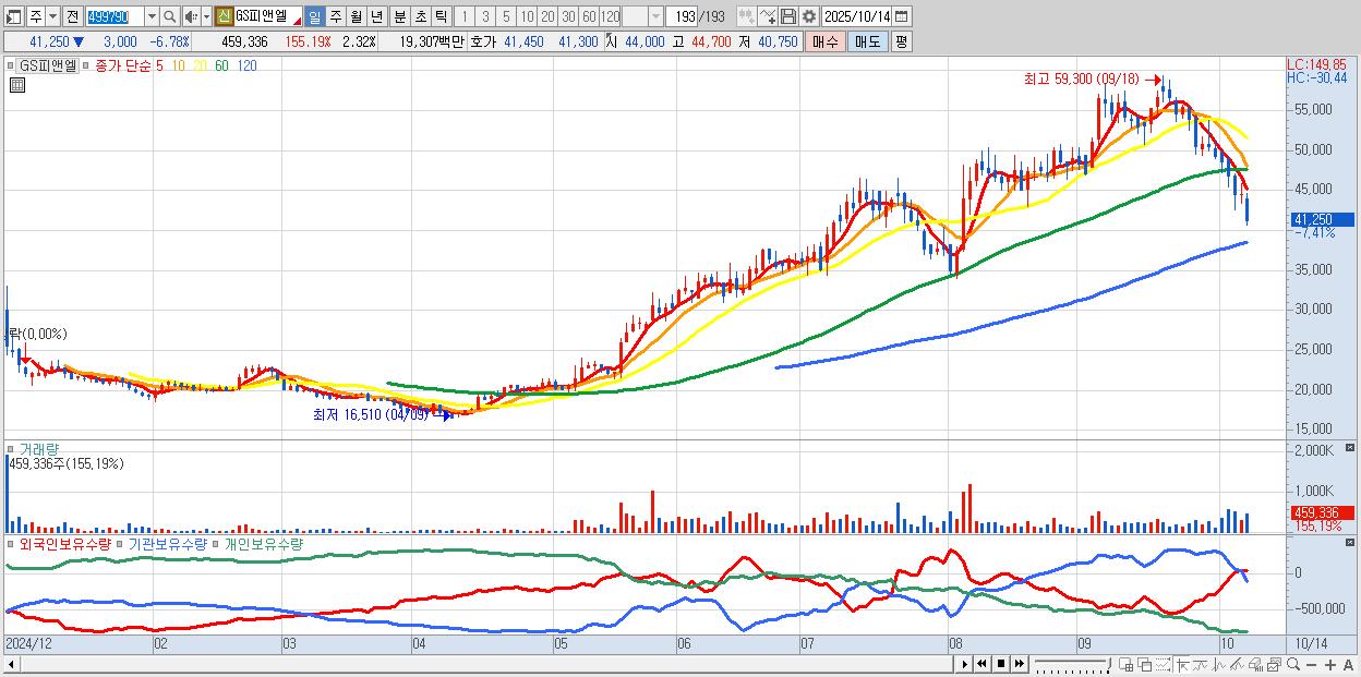 - GS피앤엘 (41,500원 ▼ -6.21% , 시총: 8,230억, 외국인 순매수 거래금:74억)