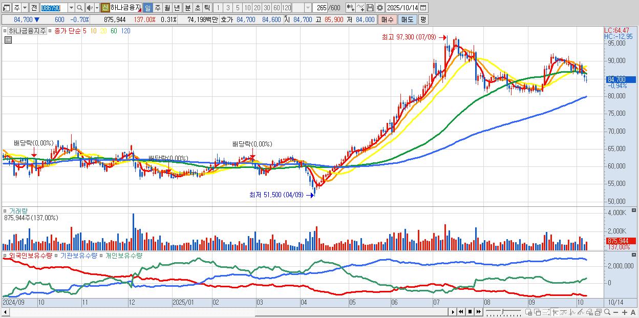 - 하나금융지주 (84,400원 ▼ -1.06% , 시총: 234,907억, 외국인 순매수 거래금:92억)
