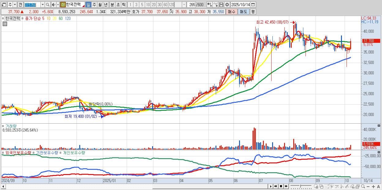 - 한국전력 (37,700원 ▲ 5.6% , 시총: 242,020억, 외국인 순매수 거래금:545억)