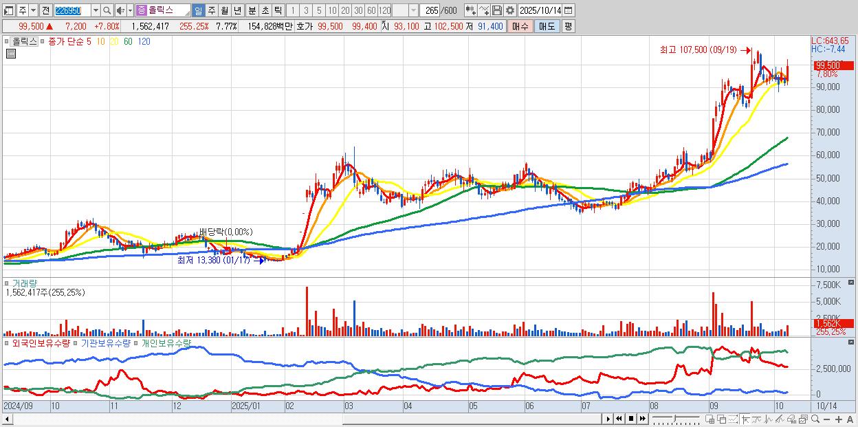 - 올릭스 (99,500원 ▲ 7.8% , 시총: 20,014억, 외국인 순매수 거래금:197억)