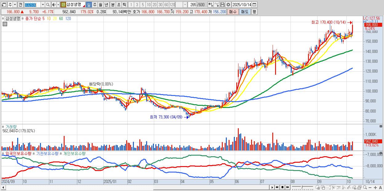 - 삼성생명 (167,000원 ▲ 6.3% , 시총: 334,000억, 외국인 순매수 거래금:121억)
