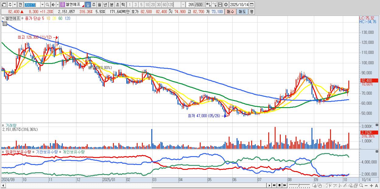 - 엘앤에프 (82,500원 ▲ 11.34% , 시총: 29,961억, 외국인 순매수 거래금:105억)
