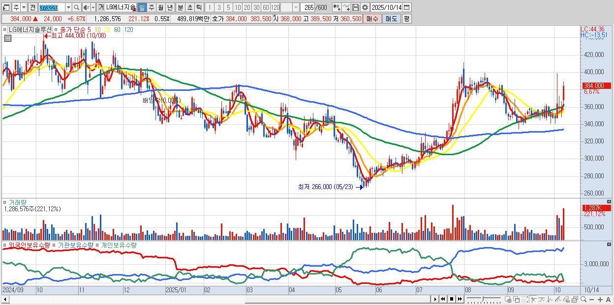 - LG에너지솔루션 (385,000원 ▲ 6.94% , 시총: 900,900억, 외국인 순매수 거래금:355억)