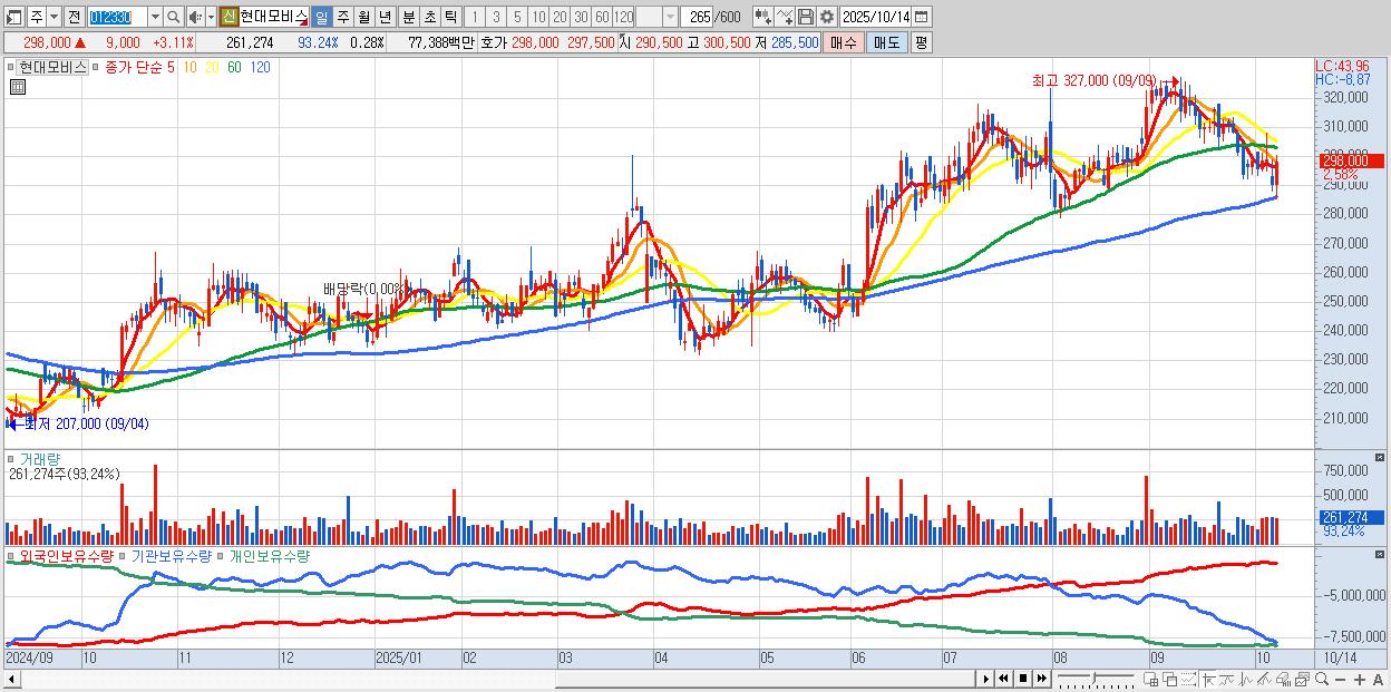 - 현대모비스 (299,500원 ▲ 3.63% , 시총: 274,926억, 외국인 순매수 거래금:213억)
