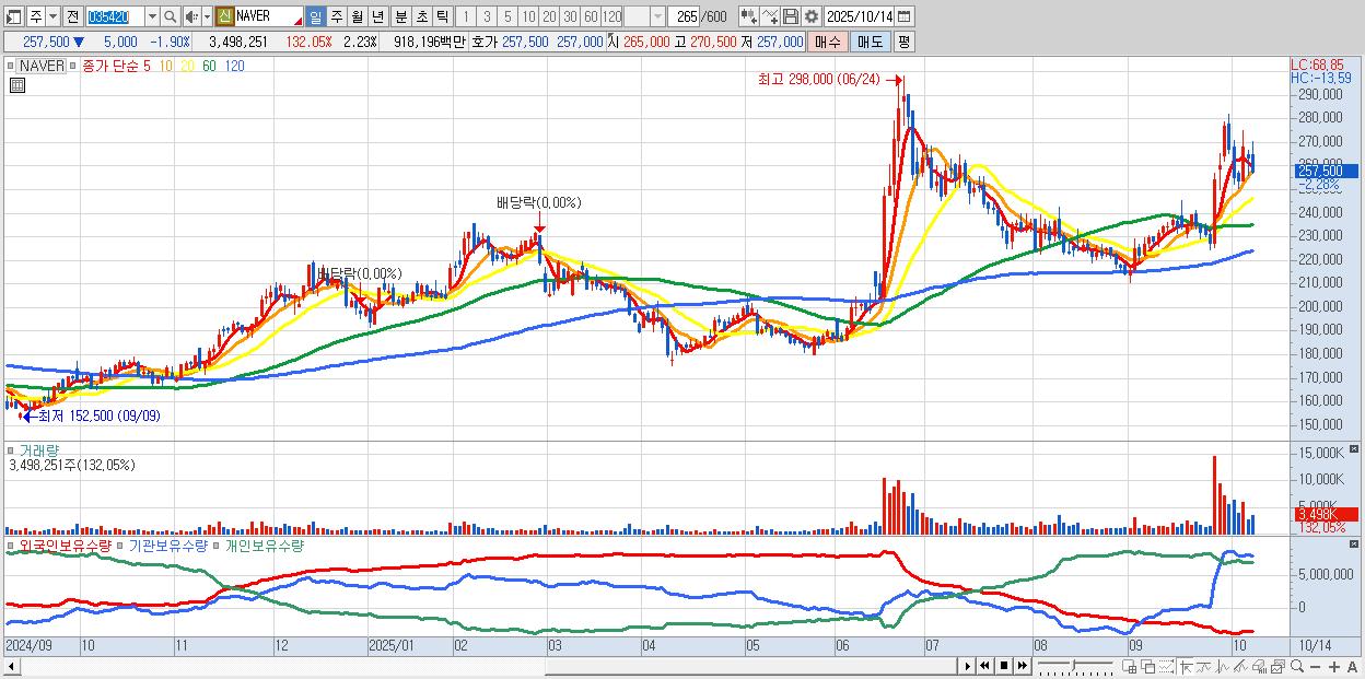 - NAVER (258,000원 ▼ -1.71% , 시총: 404,680억, 외국인 순매수 거래금:198억)