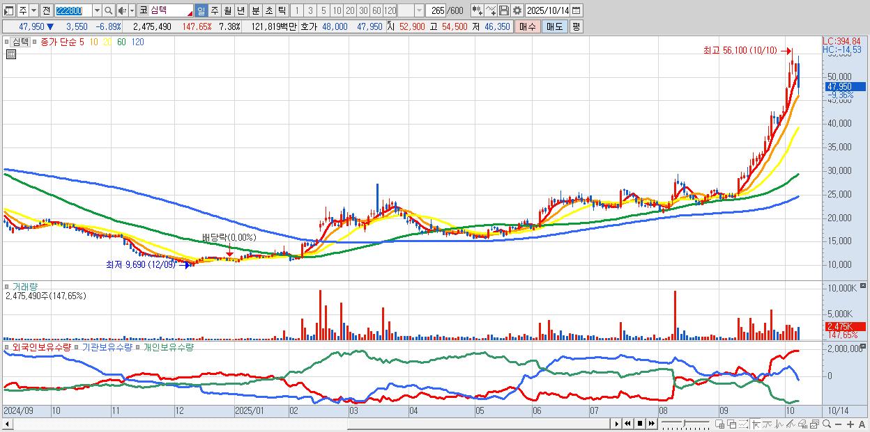- 심텍 (48,800원 ▼ -5.24% , 시총: 16,379억, 외국인 순매수 거래금:118억)