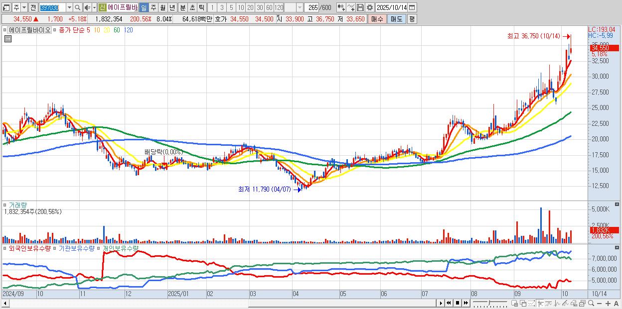 - 에이프릴바이오 (34,550원 ▲ 5.18% , 시총: 7,877억, 외국인 순매수 거래금:77억)