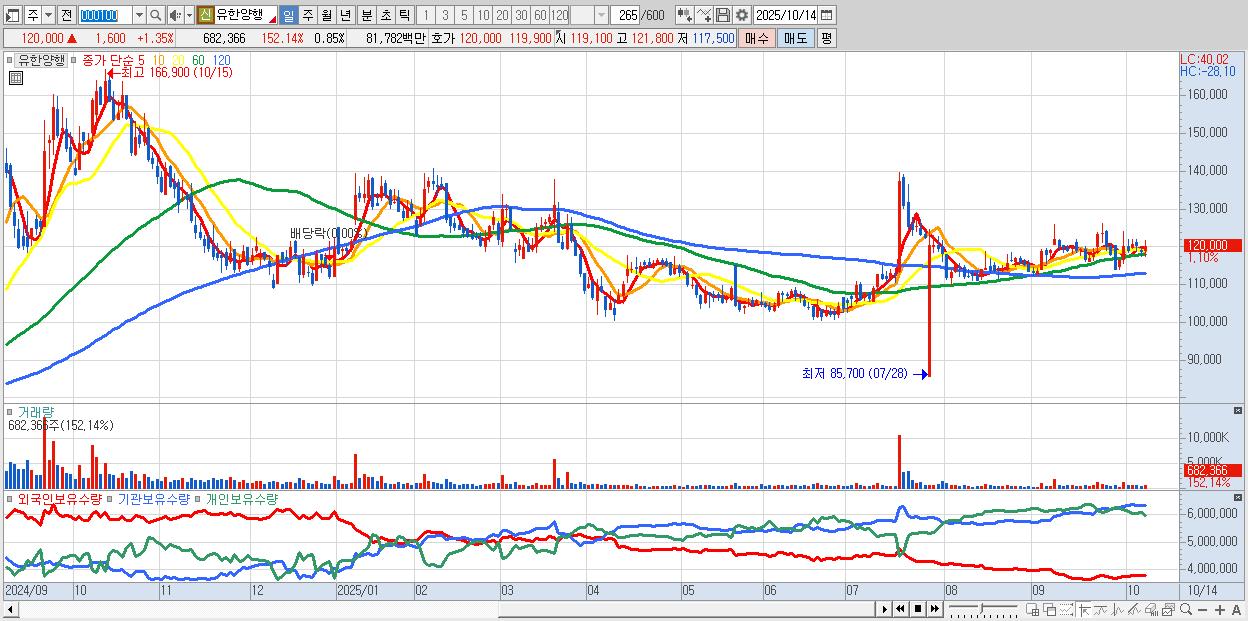 - 유한양행 (120,000원 ▲ 1.35% , 시총: 95,962억, 외국인 순매수 거래금:92억)