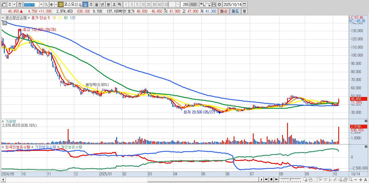 - 코스모신소재 (46,450원 ▲ 11.39% , 시총: 15,101억, 외국인 순매수 거래금:170억)