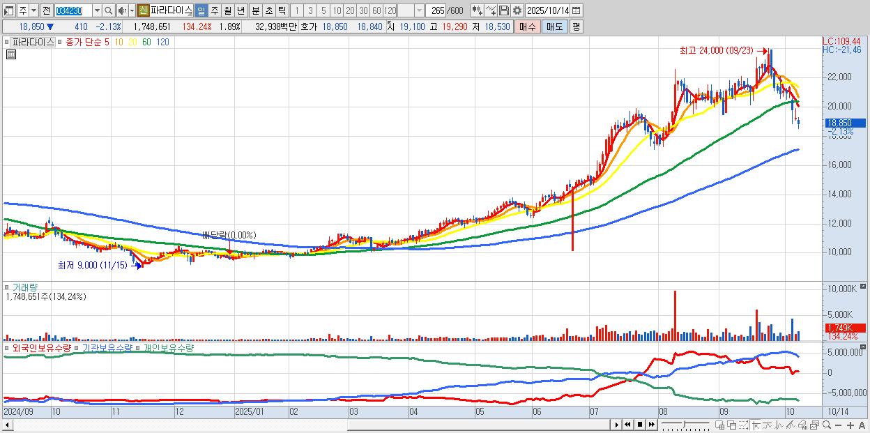 - 파라다이스 (18,850원 ▼ -2.13% , 시총: 17,418억, 외국인 순매수 거래금:131억)