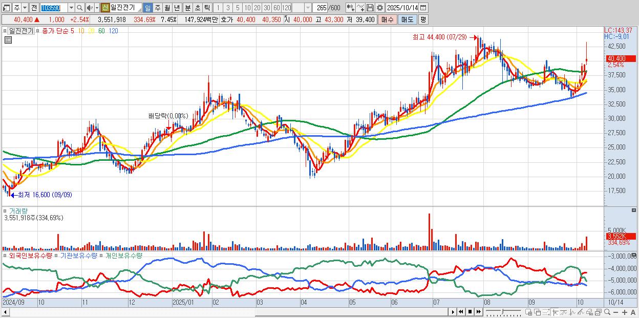 - 일진전기 (40,400원 ▲ 2.54% , 시총: 19,265억, 외국인 순매수 거래금:186억)