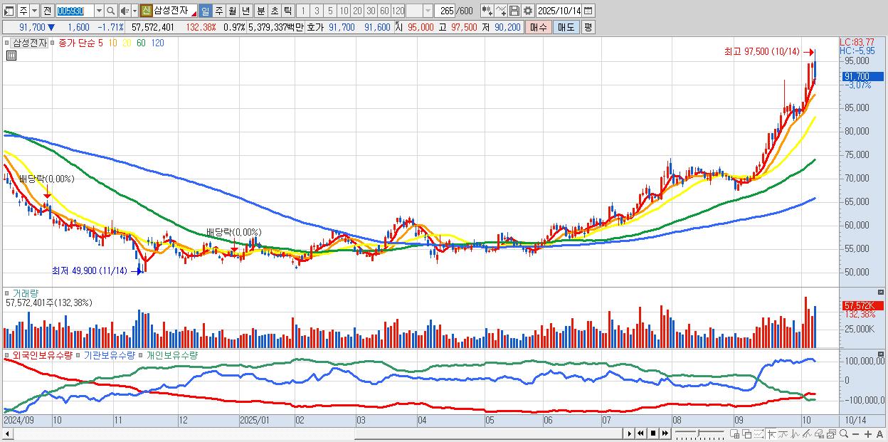 - 삼성전자 (91,600원 ▼ -1.82% , 시총: 5,422,388억, 외국인 순매수 거래금:2,512억)
