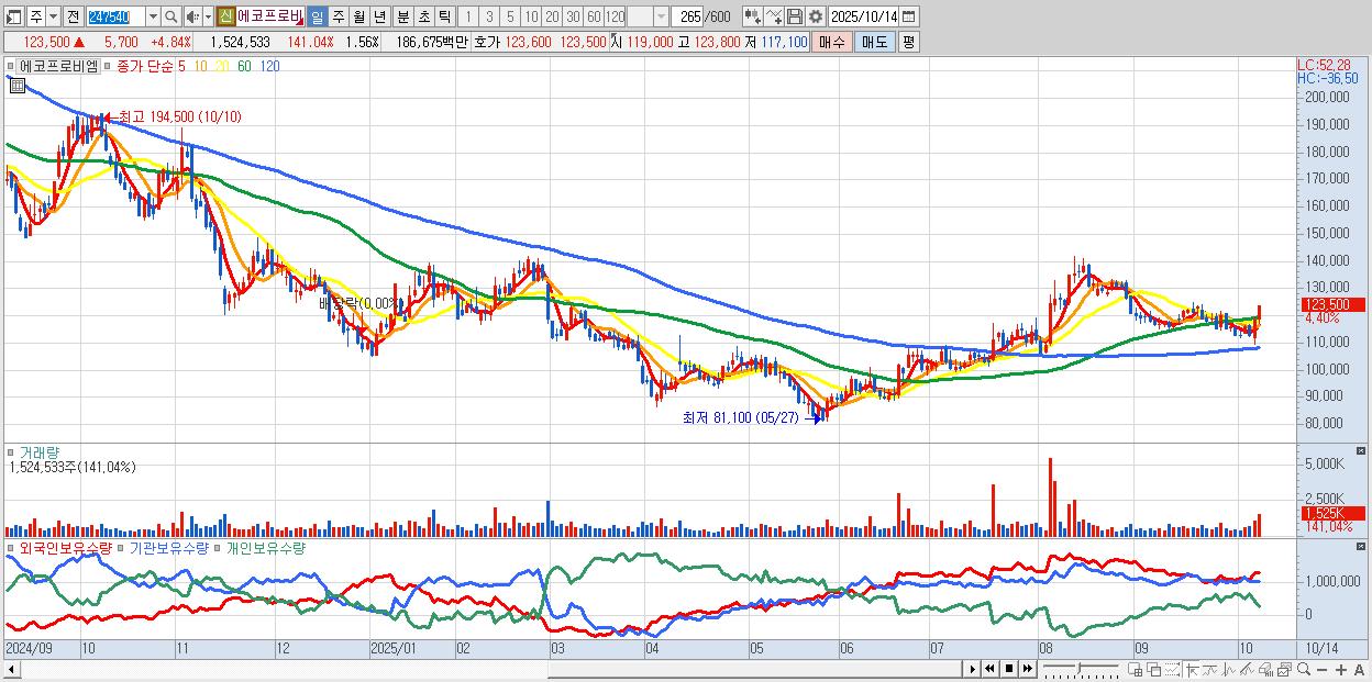 - 에코프로비엠 (123,700원 ▲ 5.01% , 시총: 120,980억, 외국인 순매수 거래금:202억)
