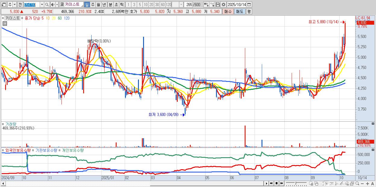 - 키이스트 (5,830원 ▲ 9.79% , 시총: 1,140억, 거래량: 469,366, 거래대금:27억, KOSDAQ)
