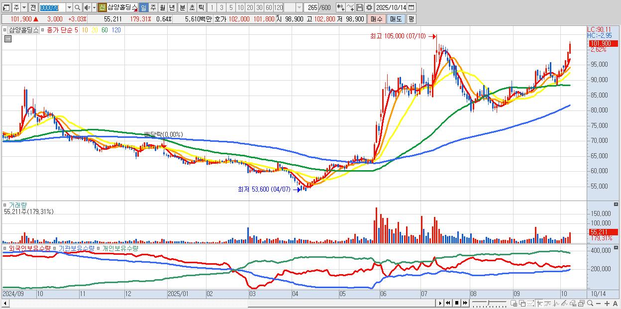 - 삼양홀딩스 (102,500원 ▲ 3.64% , 시총: 8,803억, 거래량: 35,583, 거래대금:36억, KOSPI)