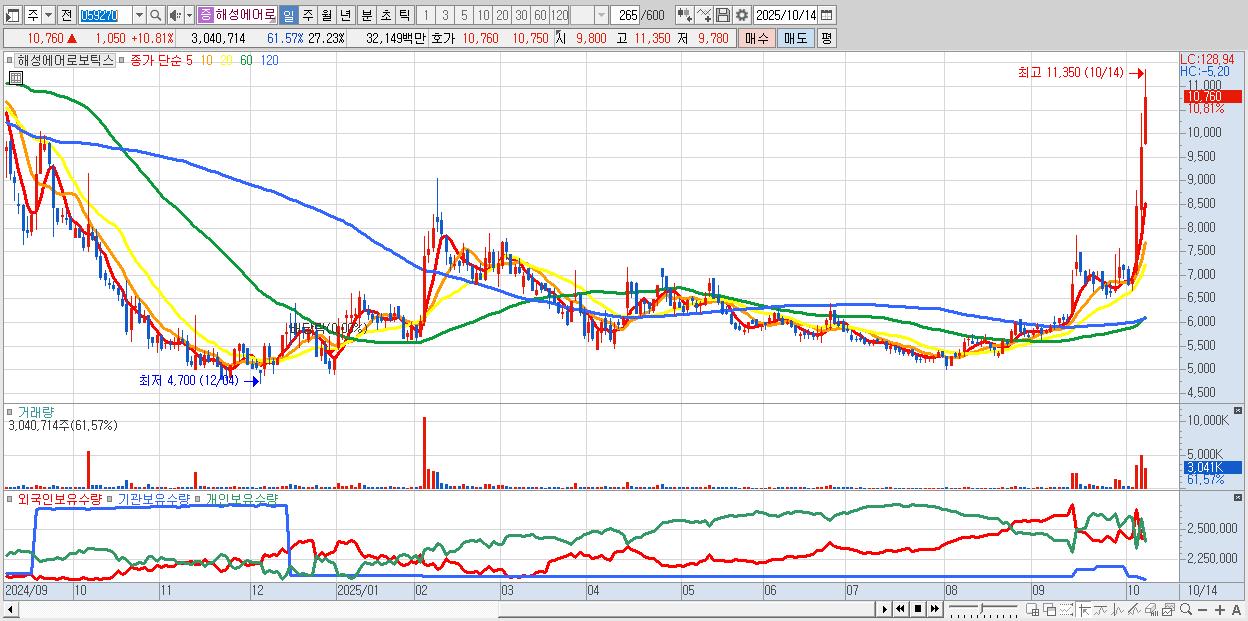 - 해성에어로보틱스 (10,760원 ▲ 10.81% , 시총: 1,201억, 거래량: 3,040,714, 거래대금:321억, KOSDAQ)