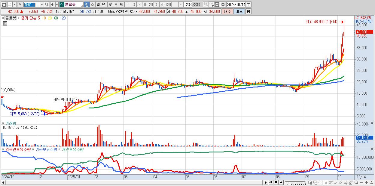- 클로봇 (42,000원 ▲ 6.73% , 시총: 10,401억, 거래량: 15,151,157, 거래대금:6,553억, KOSDAQ)