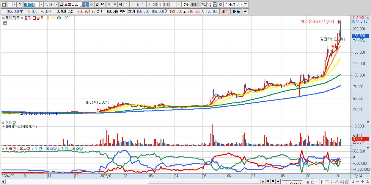- 로보티즈 (185,300원 ▼ -3.54% , 시총: 24,498억, 거래량: 3,469,022, 거래대금:6,875억)