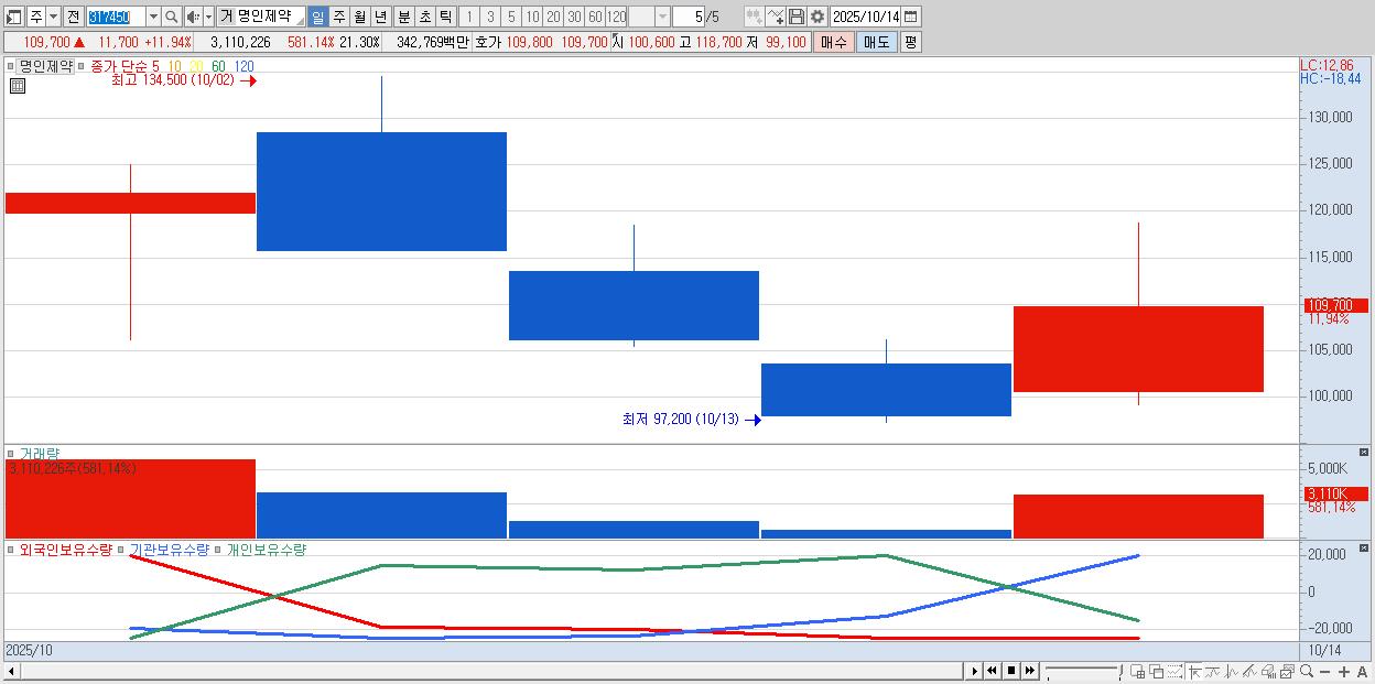 - 명인제약 (109,700원 ▲ 11.94% , 시총: 16,016억, 거래량: 3,110,226, 거래대금:3,428억)