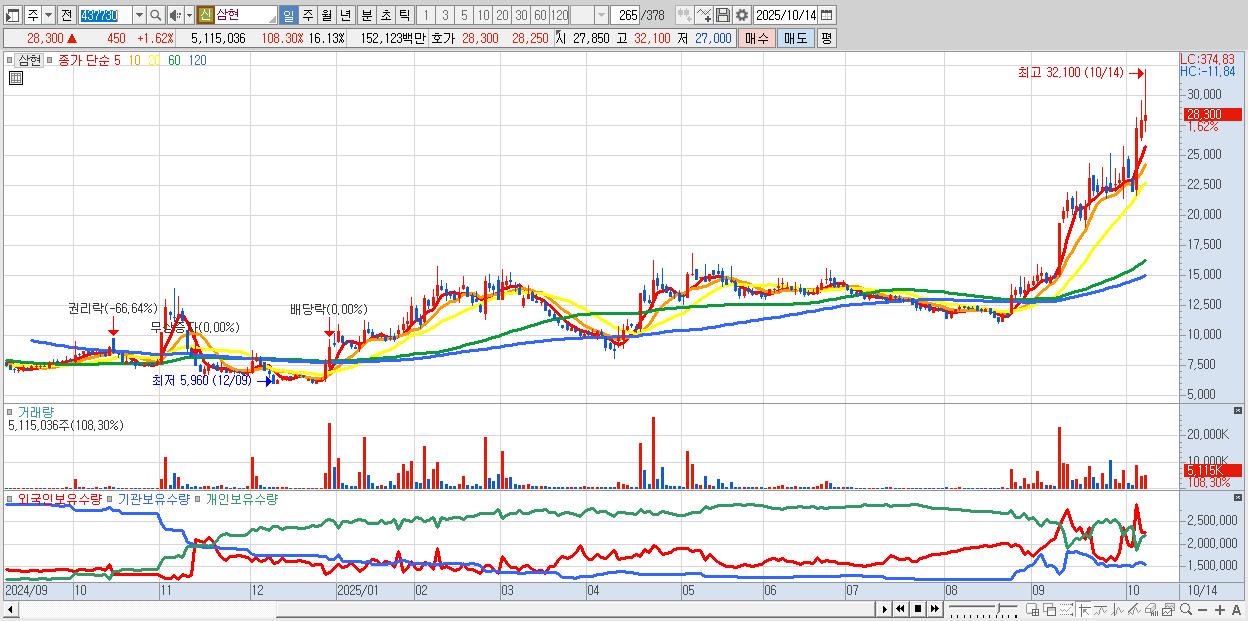 - 삼현 (28,300원 ▲ 1.62% , 시총: 8,973억, 거래량: 5,115,036, 거래대금:1,521억)