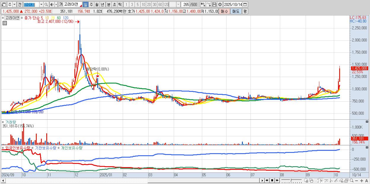 - 고려아연 (1,386,000원 ▲ 20.21% , 시총: 268,098억, 거래량: 205,548, 거래대금:2,798억)