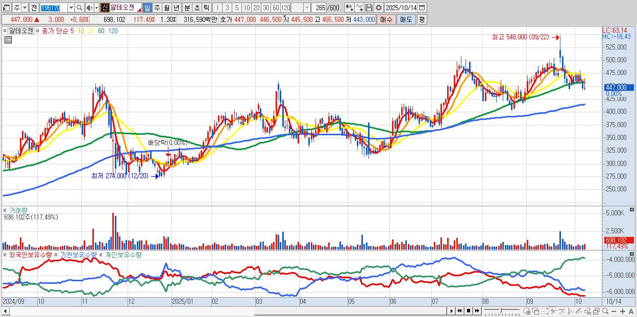 - 알테오젠 (446,000원 ▲ 0.45% , 시총: 238,636억, 거래량: 422,377, 거래대금:1,916억)