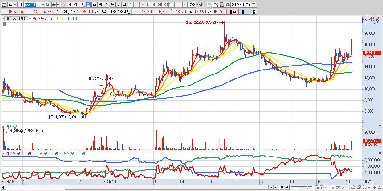 - 아이씨티케이 (16,500원 ▲ 4.63% , 시총: 2,214억, 거래량: 10,220,205, 거래대금:1,822억)