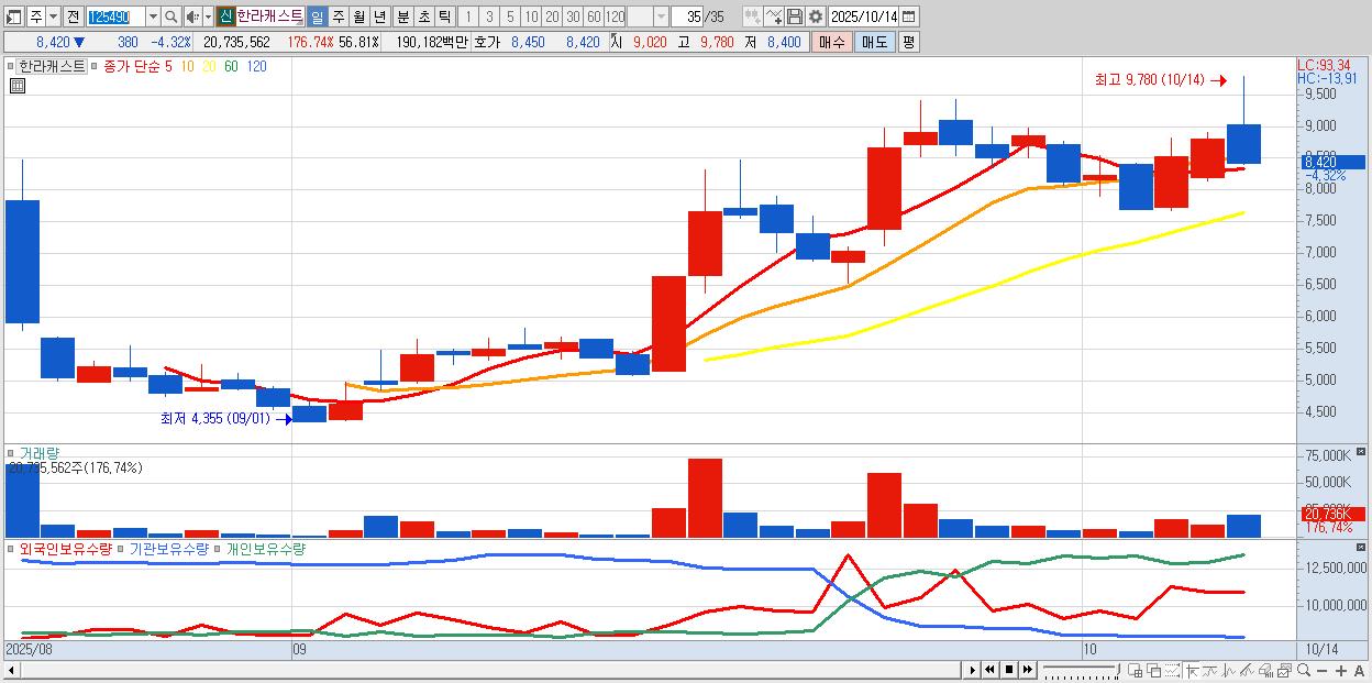 - 한라캐스트 (8,420원 ▼ -4.32% , 시총: 3,073억, 거래량: 20,735,562, 거래대금:1,902억)