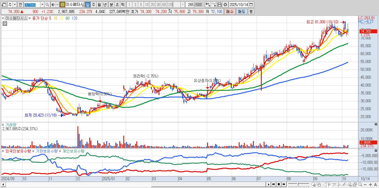 - 이수페타시스 (74,300원 ▲ 1.23% , 시총: 54,543억, 거래량: 2,967,885, 거래대금:2,270억)