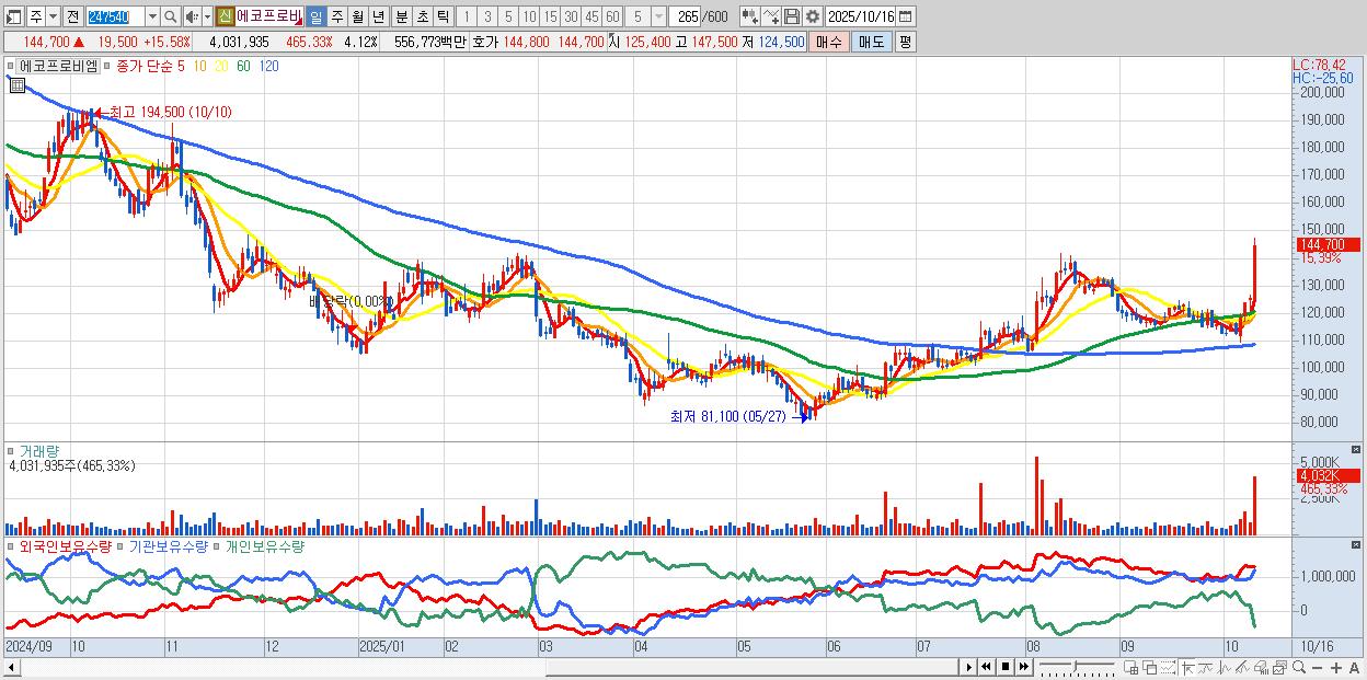 - 에코프로비엠 (143,000원 ▲ 14.22% , 시총: 139,856억, 외국인 순매수 거래금:673억)