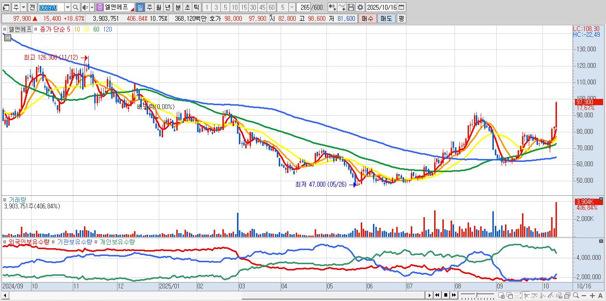 - 엘앤에프 (98,400원 ▲ 19.27% , 시총: 35,735억, 외국인 순매수 거래금:191억)