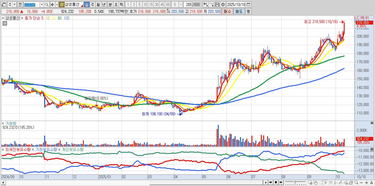- 삼성물산 (217,000원 ▲ 5.34% , 시총: 368,849억, 외국인 순매수 거래금:144억)