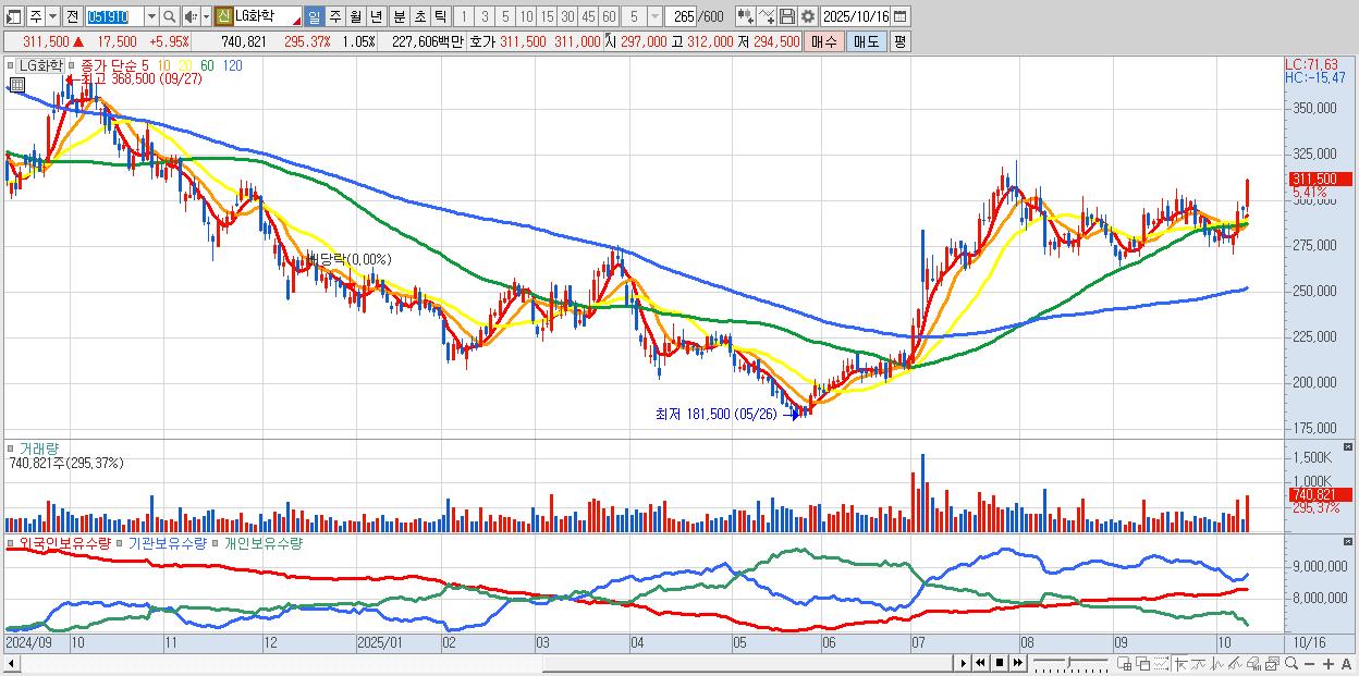 - LG화학 (312,000원 ▲ 6.12% , 시총: 220,248억, 외국인 순매수 거래금:380억)