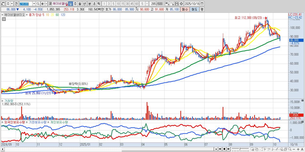 - 에이비엘바이오 (86,300원 ▼ -4.22% , 시총: 47,573억, 외국인 순매수 거래금:237억)