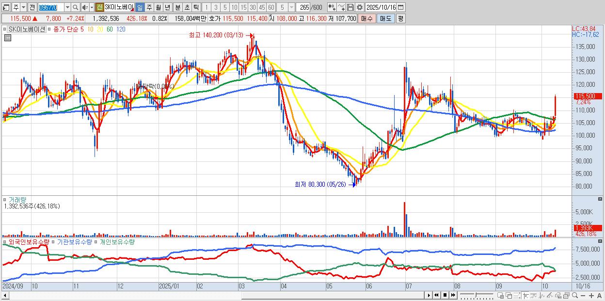 - SK이노베이션 (116,000원 ▲ 7.71% , 시총: 196,101억, 외국인 순매수 거래금:264억)