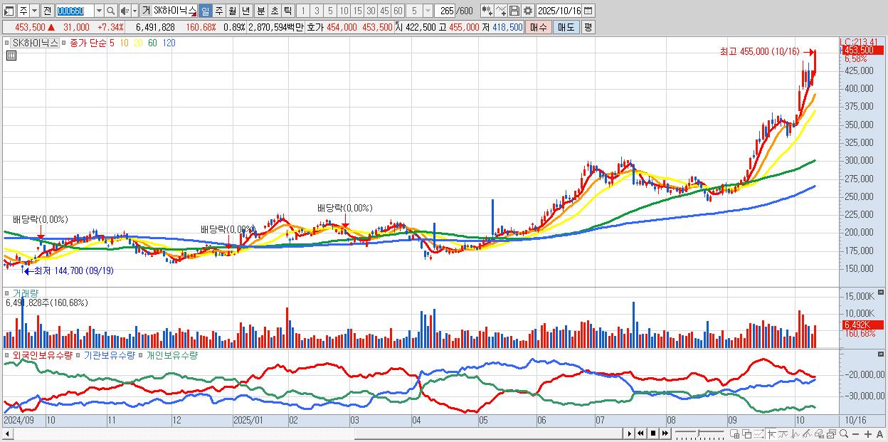 - SK하이닉스 (452,500원 ▲ 7.1% , 시총: 3,294,211억, 외국인 순매수 거래금:1,538억)